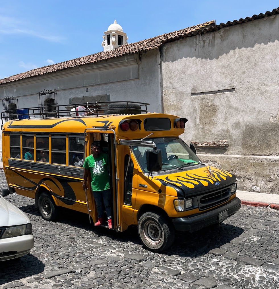 The chicken buses are famous for not only transporting, you know, chickens, as well as humans and other animals but also for another reason. They are literally old-school buses from the US that were transported over to Guatemala, painted over in bright colors, and now serve as an important and authentic mode of transport.